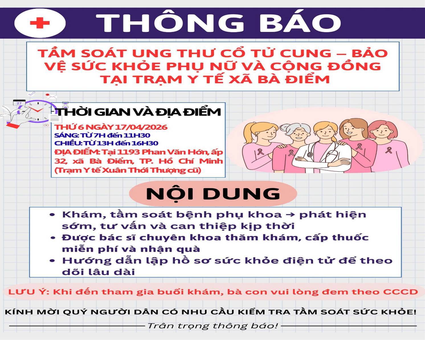 Các chị/em Phụ nữ trên địa bàn xã hãy đến Trạm Y tế xã Bà Điểm (địa chỉ 1193 đường Phan Văn Hớn, ấp 32, xã Bà Điểm, Thành phố Hồ Chí Minh) hoặc cơ sở y tế gần nhất để khám tầm soát bệnh phụ khoa, nhằm phát hiện và điều trị bệnh kịp thời. Vì sức khỏe của chị/em Phụ nữ, với thông điệp“Hãy thương mình ở tương lai” vì chỉ có chính bạn mới có thể lựa chọn hành động từ bây giờ để bản thân ở tương lai nhận được điều tích cực.