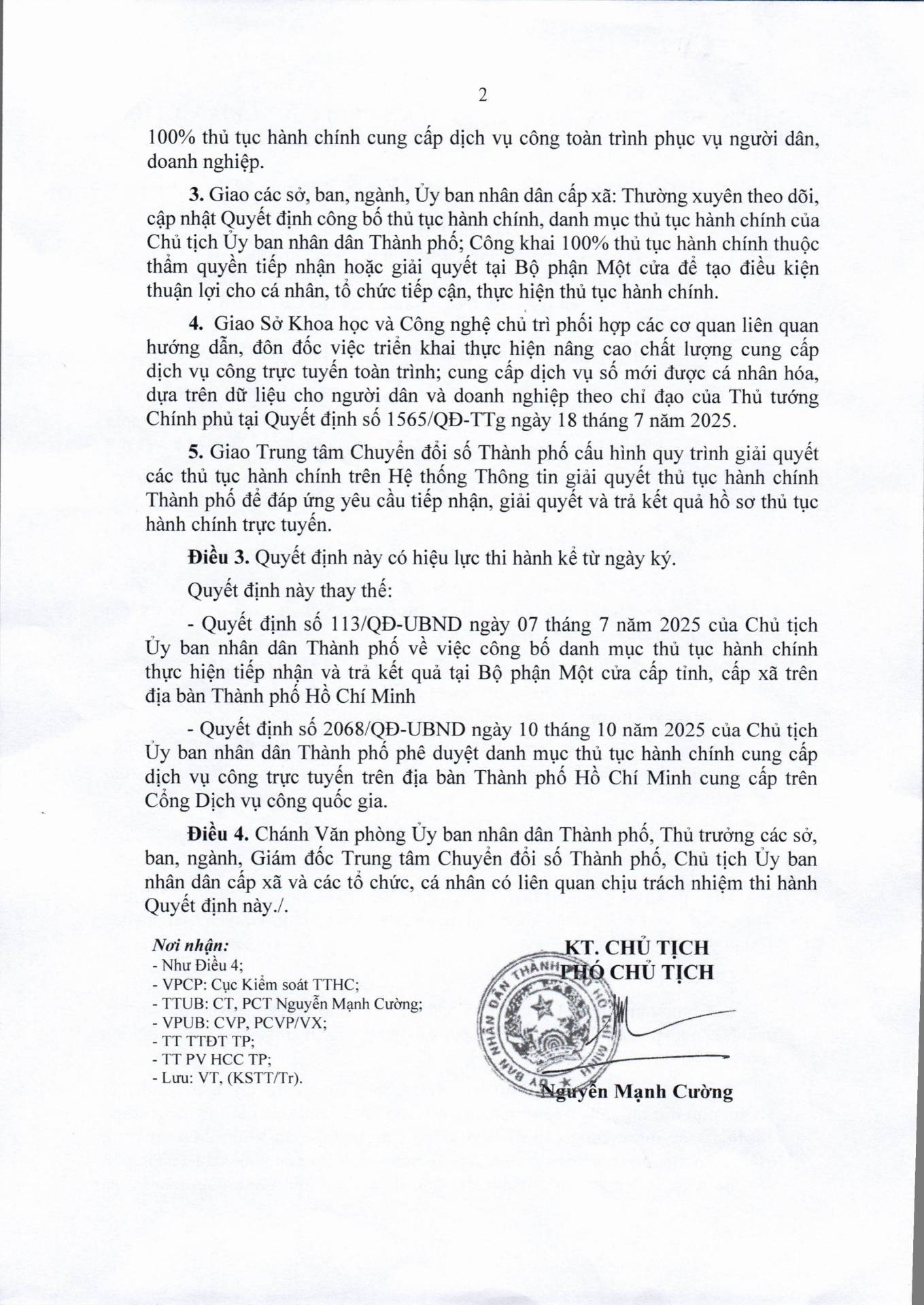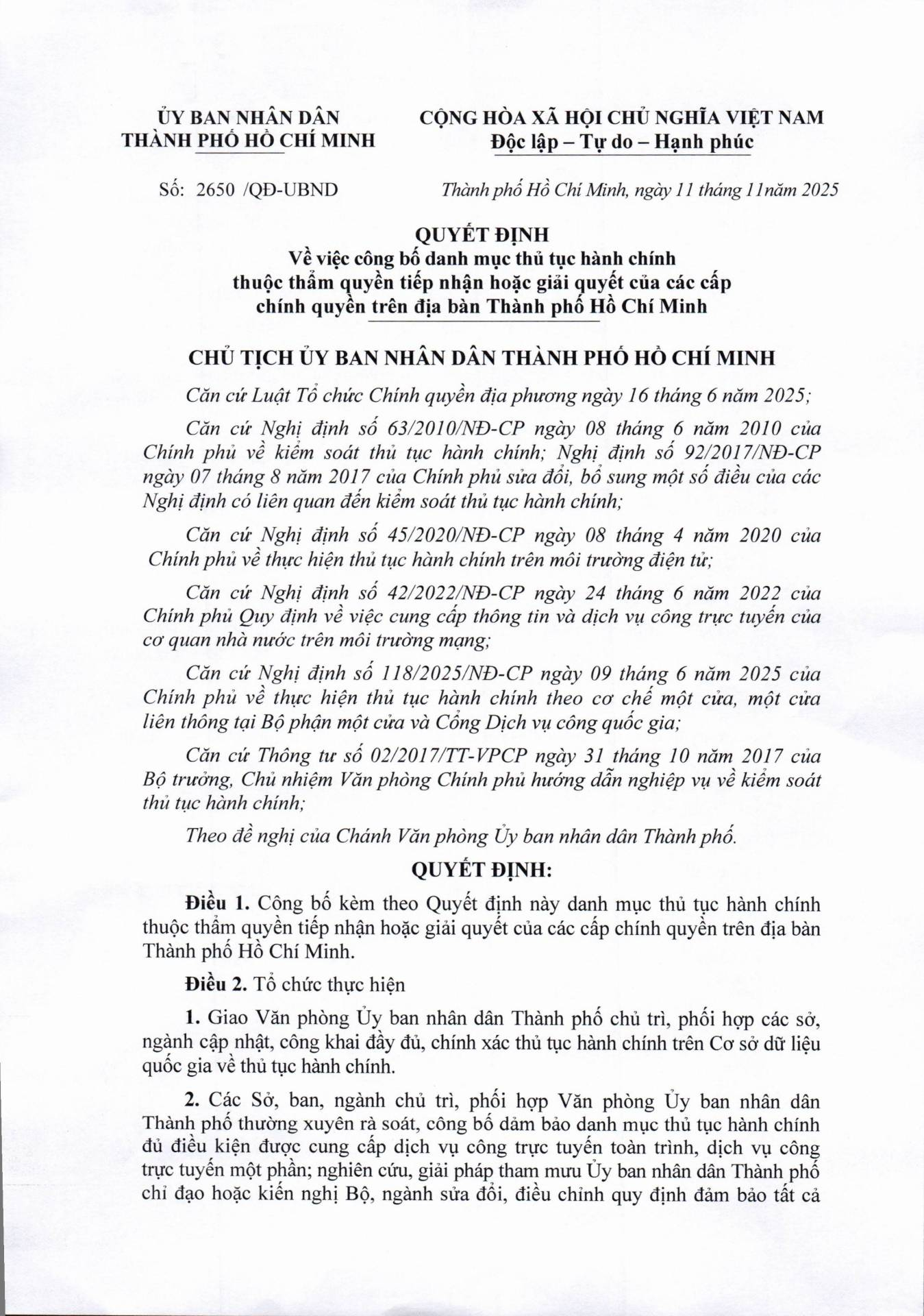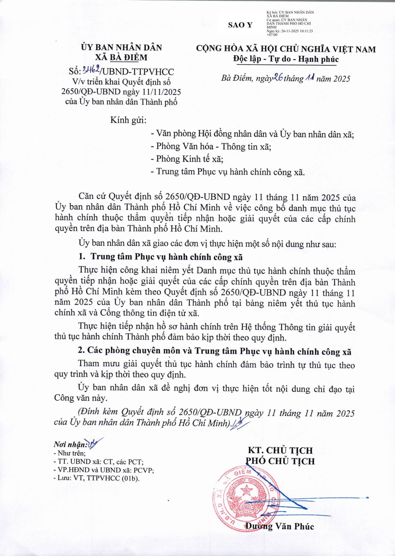 CÔNG VĂN 3642/UBND-TTPVHCC XÃ BÀ ĐIỂM VỀ VIỆC TRIỂN KHAI QUYẾT ĐỊNH SỐ 2650-QĐ/UBND NGÀY 11/11/2025 CỦA ỦY BAN NHÂN DÂN THÀNH PHỐ HỒ CHÍ MINH