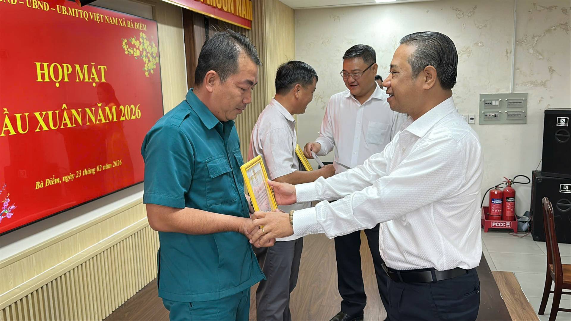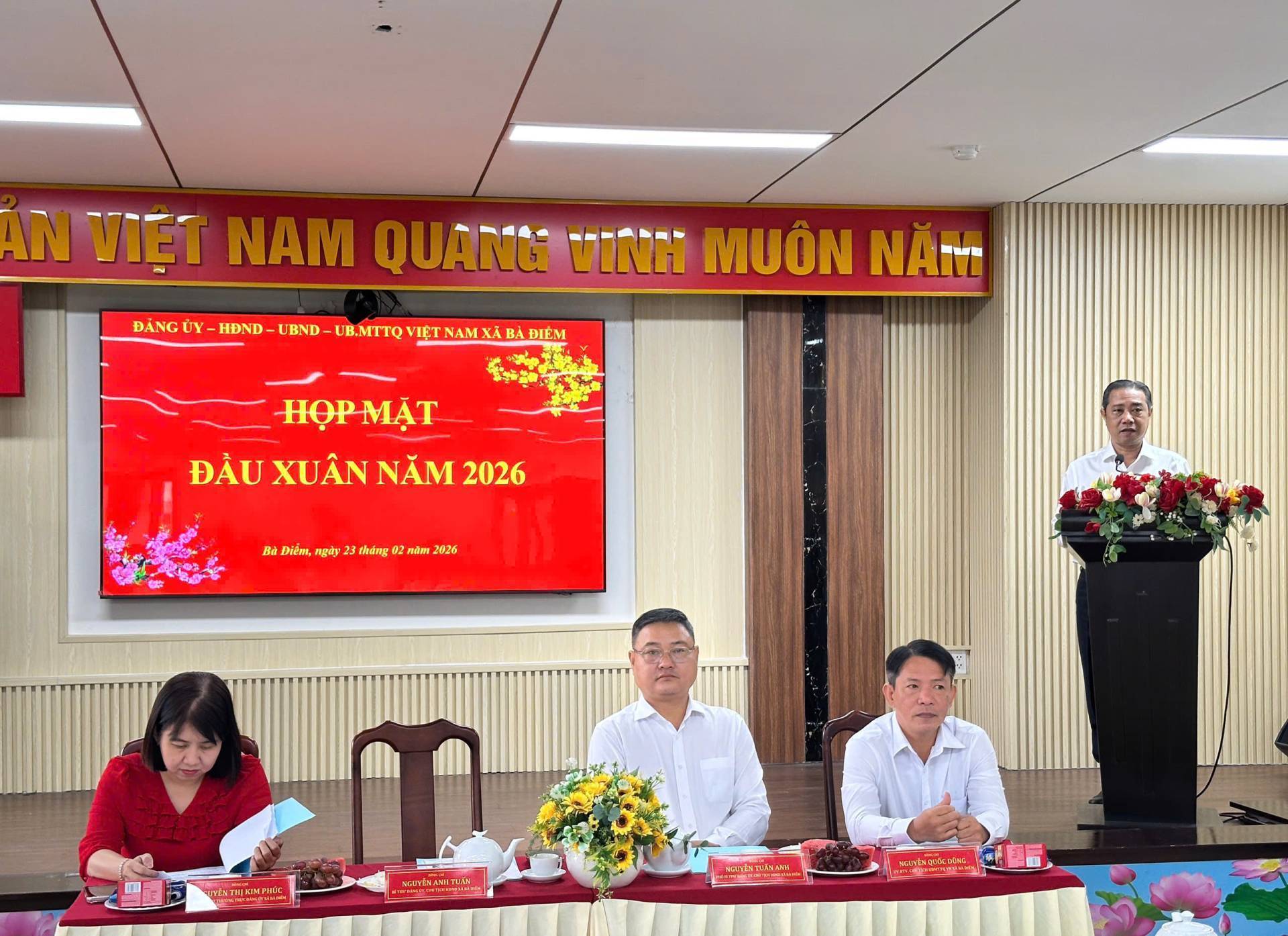 Sáng ngày 23/02/2026 (nhằm mùng 7 Tết Nguyên đán Bính Ngọ), Đảng ủy - Hội đồng nhân dân - Ủy ban nhân dân - Ủy ban Mặt trận Tổ quốc Việt Nam xã Bà Điểm đã tổ chức buổi họp mặt đầu Xuân năm 2026 trong không khí vui tươi, ấm áp và phấn khởi.