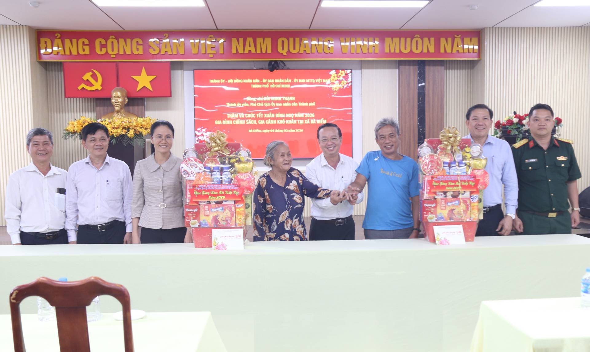 Ngoài ra, Đoàn còn đến thăm hỏi tình hình đời sống, tặng quà và chúc Tết hộ bà Trần Thị Ngọc Vệ (hộ cận nghèo) và gia đình em Trần Ngọc Quyên (trẻ em có hoàn cảnh đặc biệt khó khăn), ngụ xã Bà Điểm. Đồng chí Bùi Minh Thạnh mong 02 gia đình hãy nỗ lực, cố gắng vươn lên, nhanh chóng ổn định cuộc sống. Đồng chí chúc 02 gia đình đón Xuân Bính Ngọ năm 2026 trong không khí vui tươi, đầm ấm.