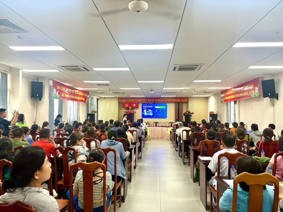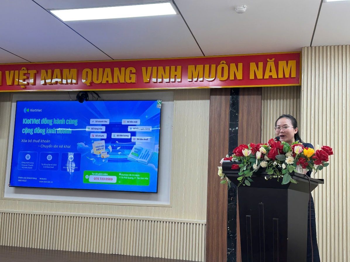 Hội nghị có sự tham dự của ông Trần Minh Tuấn, Phó Chánh Văn phòng HĐND – UBND xã, bà Đinh Thụy Hồng Châu – Phó Trưởng phòng Kinh tế xã, bà Lâm Thị Kiều Oanh – Phó Trưởng Thuế Cơ sở 12 Thành phố Hồ Chí Minh, bà Trần Thị Mai Thảo – Chủ tịch HĐTV công ty TNHH dịch vụ và tư vấn thuế Gia Long, ông Hoàng Vũ Tứ – Phó Phòng khách hàng Ngân hàng Vietcombank Thống Nhất, bà Võ Thị Tú Như – Đại diện nhà cung cấp giải pháp hóa đơn điện tử KiotViet cùng hơn 200 hộ kinh doanh trên địa bàn xã.