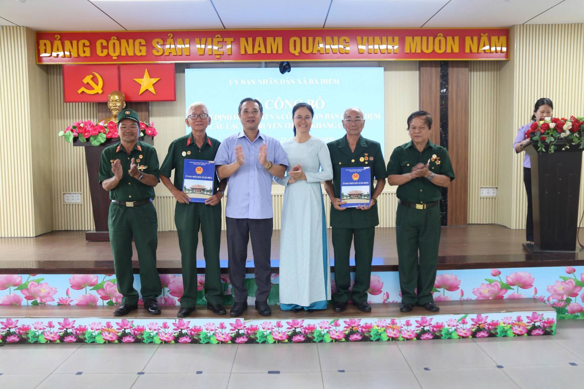 Tại buổi lễ, đồng chí Dương Thị Mỹ công bố Quyết định số 1940/QĐ-UBND ngày 03/4/2026 của UBND xã Bà Điểm về việc cho phép hợp nhất Câu lạc bộ Truyền thống kháng chiến xã Trung Chánh; Câu lạc bộ Truyền thống kháng chiến xã Xuân Thới Thượng và Câu lạc bộ Truyền thống kháng chiến xã Bà Điểm (cũ) thành Câu lạc bộ Truyền thống kháng chiến xã Bà Điểm.