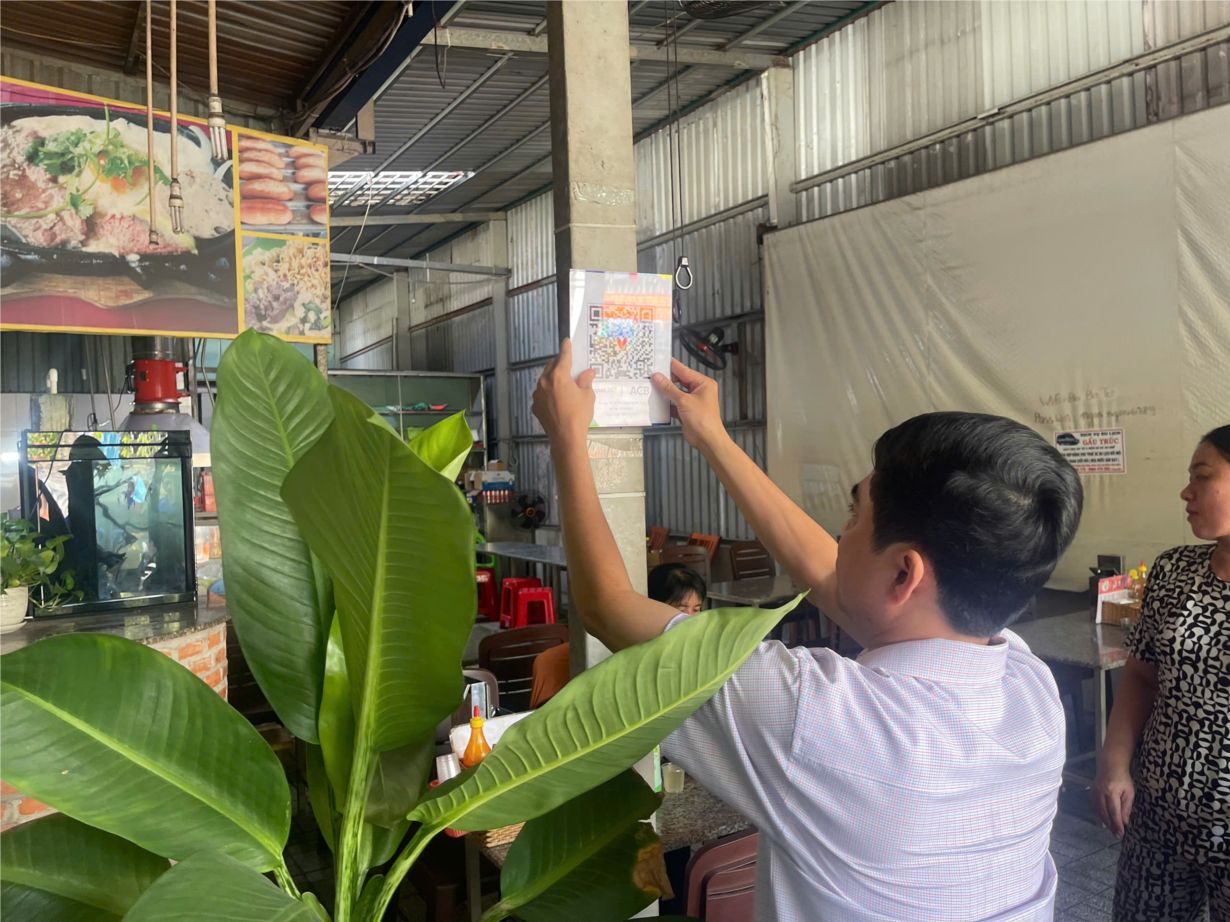 Tại buổi lễ, bà Trần Thị Thanh Quyên đã báo cáo kết quả triển khai, nhấn mạnh sự hưởng ứng tích cực từ các hộ kinh doanh và người dân. Ban tổ chức cũng đã trao 50 bảng QR code cho các hộ dân để thúc đẩy thanh toán điện tử, giúp giao dịch trở nên nhanh chóng, an toàn và thuận tiện hơn.