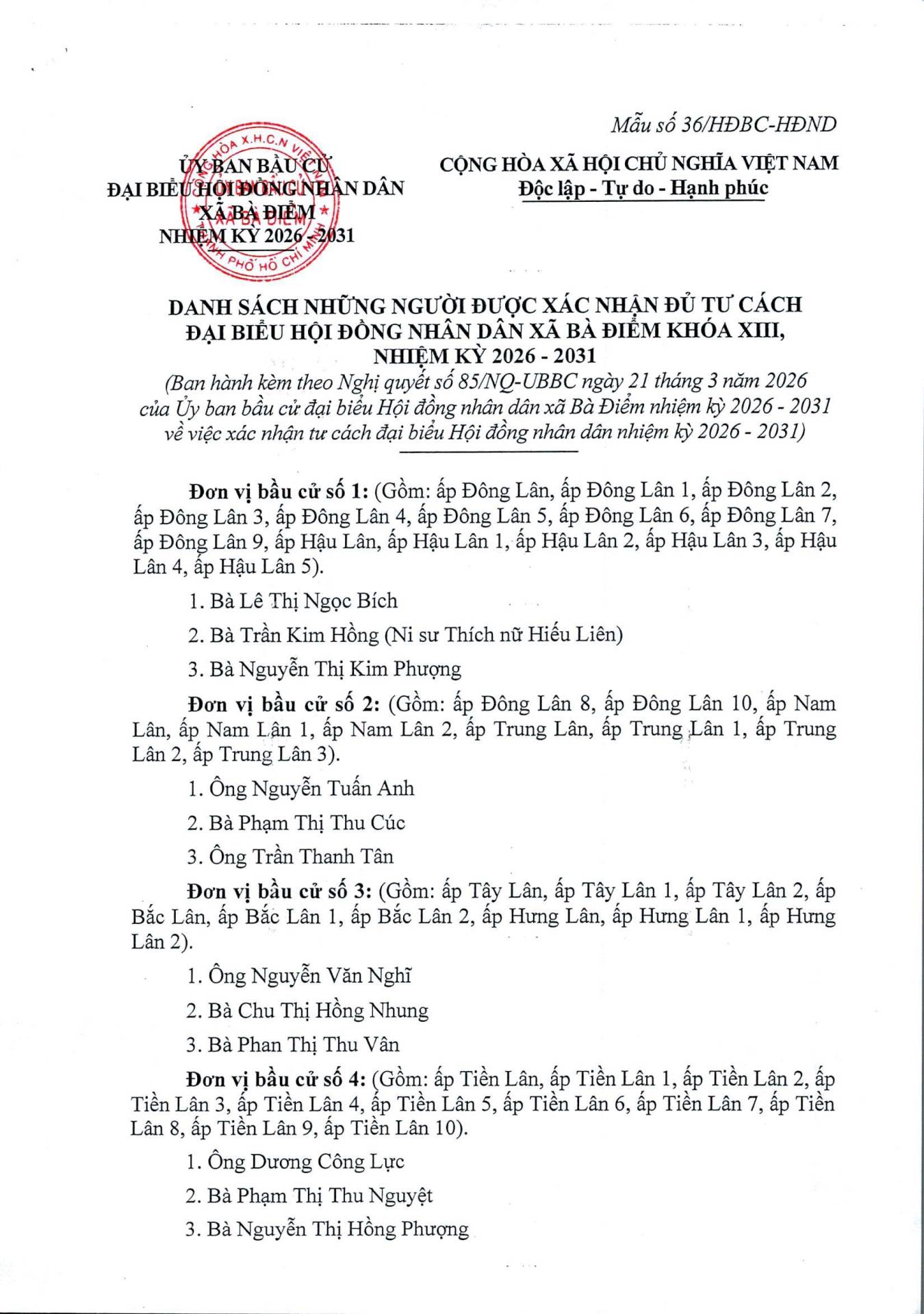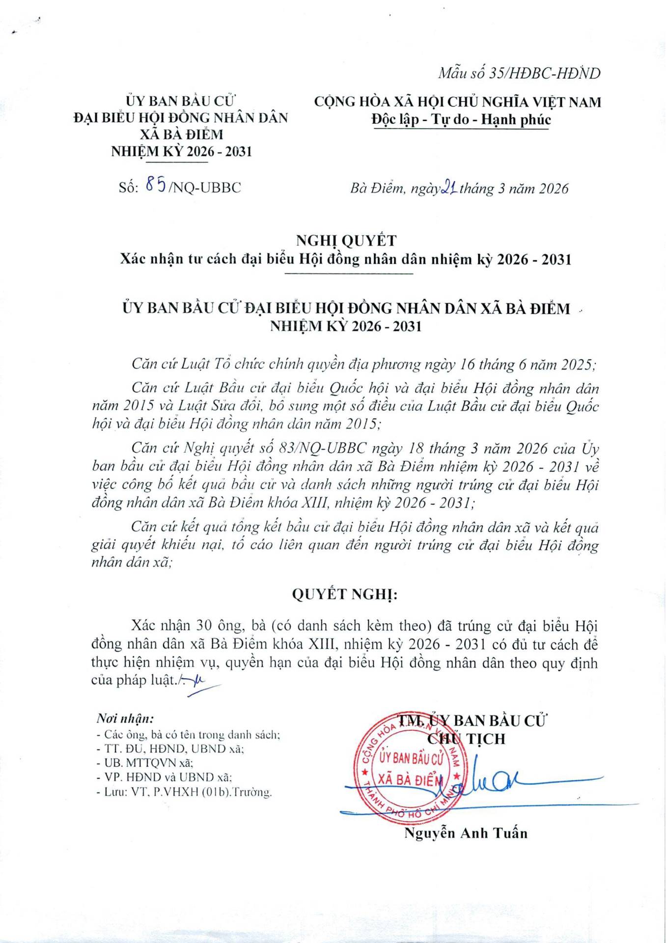NGHỊ QUYẾT XÁC NHẬN TƯ CÁCH ĐẠI BIỂU HỘI ĐỒNG NHÂN DÂN XÃ BÀ ĐIỂM KHÓA XIII, NHIỆM KỲ 2026 - 2031