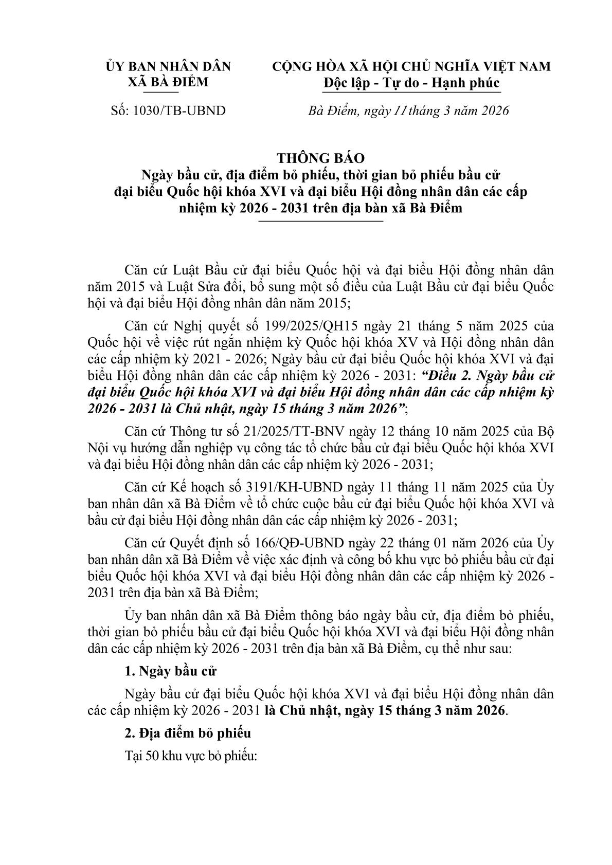 THÔNG BÁO NGÀY BẦU CỬ, ĐỊA ĐIỂM VÀ THỜI GIAN BỎ PHIẾU BẦU CỬ ĐẠI BIỂU QUỐC HỘI KHÓA XVI VÀ ĐẠI BIỂU HỘI ĐỒNG NHÂN DÂN CÁC CẤP NHIỆM KỲ 2026 - 2031 TRÊN ĐỊA BÀN XÃ BÀ ĐIỂM