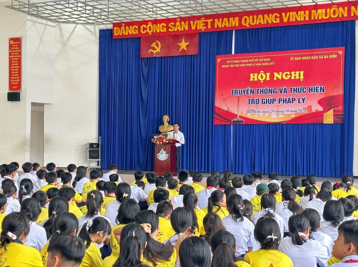 Thực hiện Kế hoạch số 2850/KH-UBND ngày 22/10/2025 về tổ chức truyền thông và thực hiện trợ giúp pháp lý 3 tháng cuối năm 2025 trên địa bàn xã Bà Điểm, sáng ngày 29 tháng 10 năm 2025, Ủy ban nhân dân xã Bà Điểm với Trung tâm Trợ giúp pháp lý Nhà nước số 1 Thành phố Hồ Chí Minh phối hợp trường THCS Bùi Văn Thủ tổ chức hội nghị truyền thông pháp luật và trợ giúp pháp lý cho 300 học sinh.