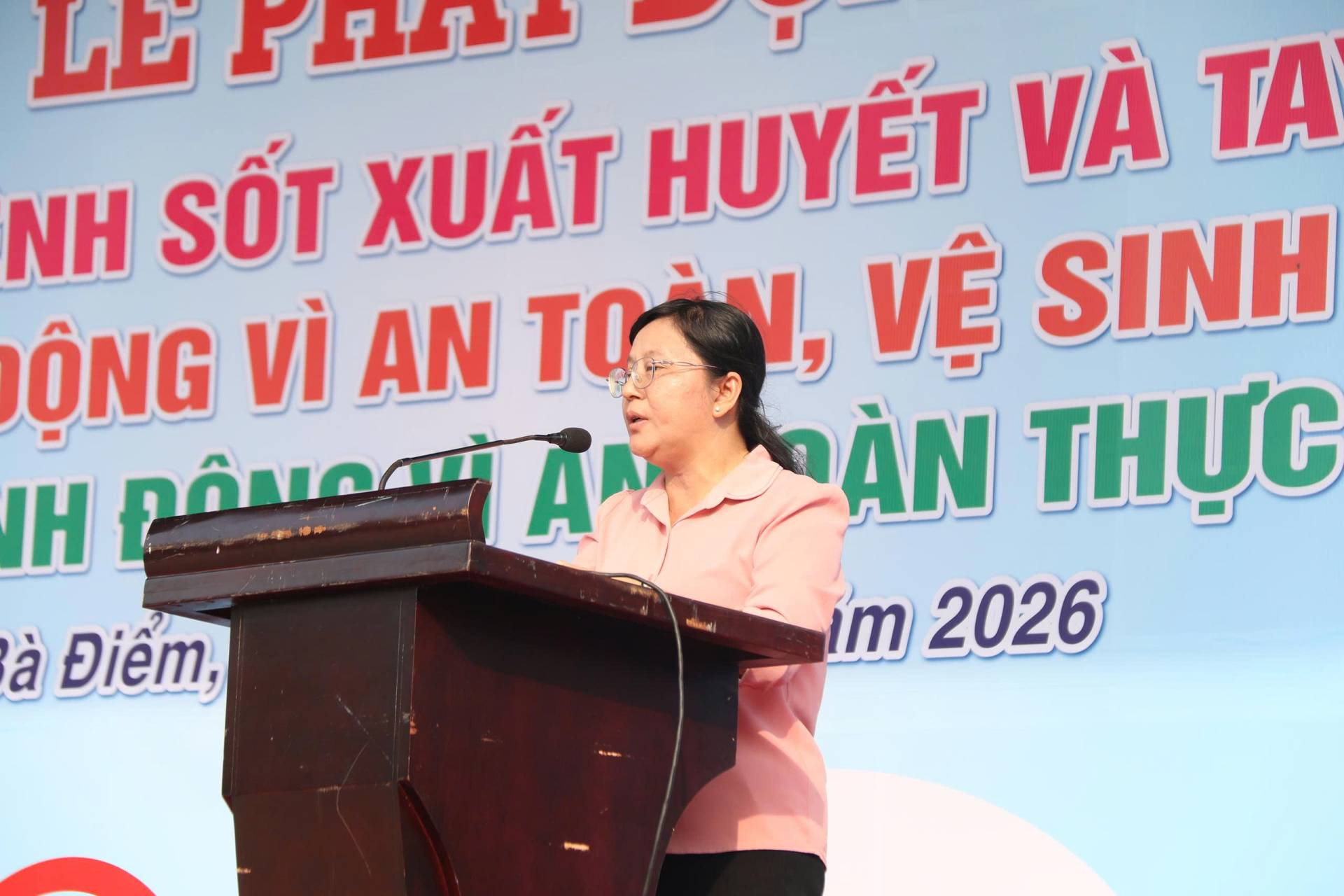 Tại buổi lễ, đồng chí Dương Thị Mỹ phát biểu phát động phòng, chống bệnh Sốt xuất huyết và bệnh Tay chân miệng; hưởng ứng Tháng hành động vì an toàn, vệ sinh lao động; Tháng hành động vì an toàn thực phẩm năm 2026.