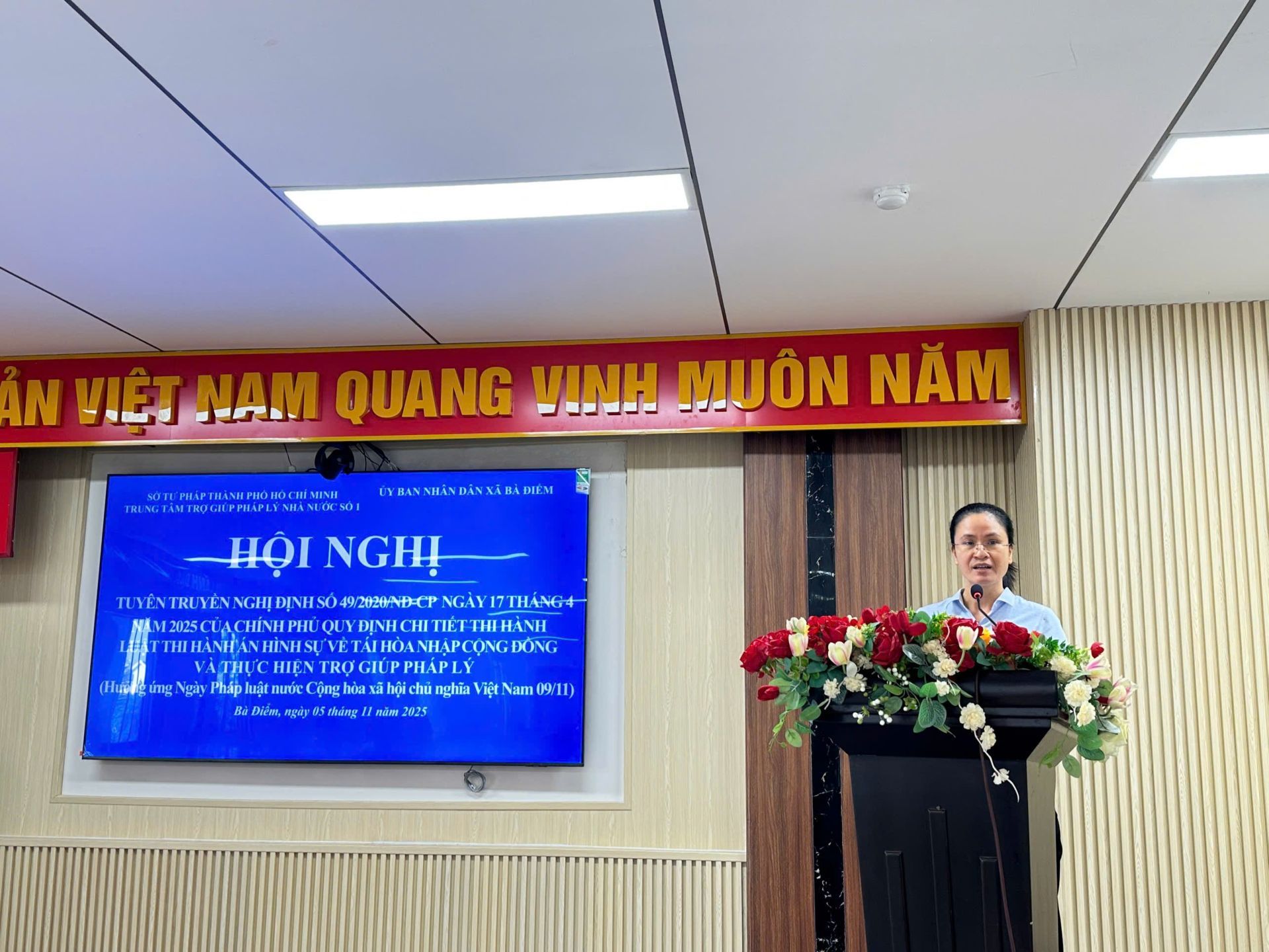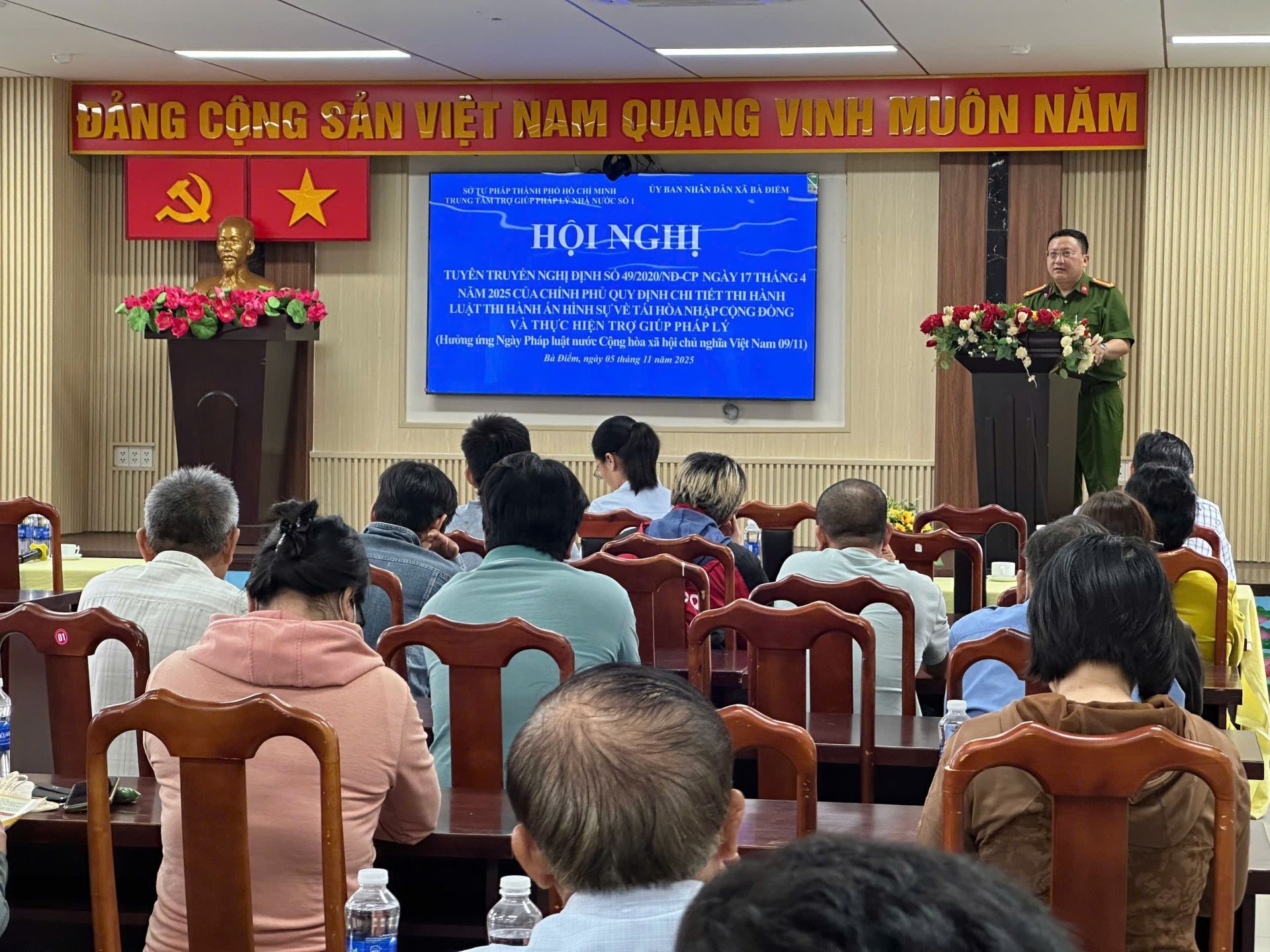 Thực hiện Kế hoạch số 2850/KH-UBND ngày 22 tháng 10 năm 2025 về tổ chức truyền thông và thực hiện trợ giúp pháp lý 3 tháng cuối năm 2025 trên địa bàn xã Bà Điểm, sáng ngày 07 tháng 11 năm 2025, Ủy ban nhân dân xã Bà Điểm phối hợp với Trung tâm Trợ giúp pháp lý Nhà nước số 1 Thành phố Hồ Chí Minh tổ chức Hội nghị tuyên truyền Nghị định số 49/2020/NĐ-CP ngày 17 tháng 4 năm 2020 của Chính phủ, quy định chi tiết thi hành Luật Thi hành án hình sự về tái hòa nhập cộng đồng và thực hiện trợ giúp pháp lý tại Hội trường Ủy ban nhân dân xã với hơn 60 người tham dự.