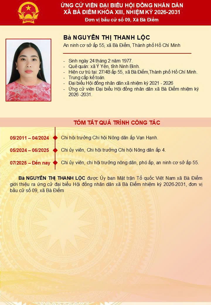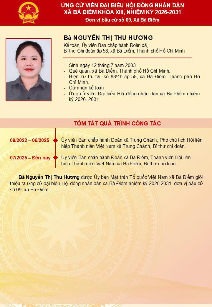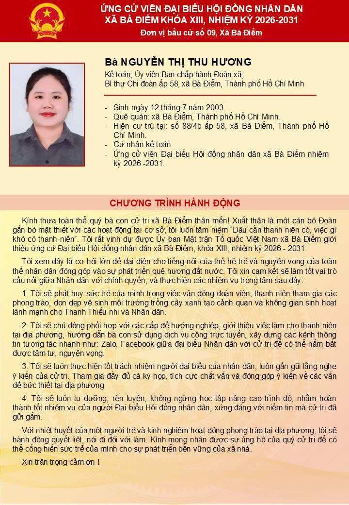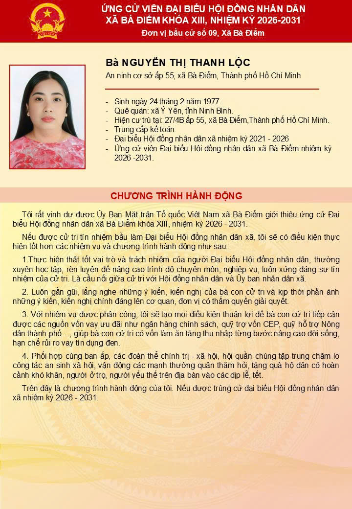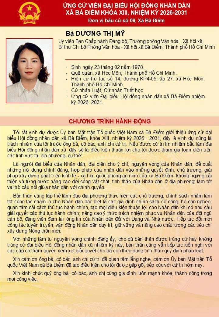 ỨNG CỬ VIÊN ĐẠI BIỂU HĐND XÃ BÀ ĐIỂM KHÓA XIII - Đơn vị bầu cử số 9