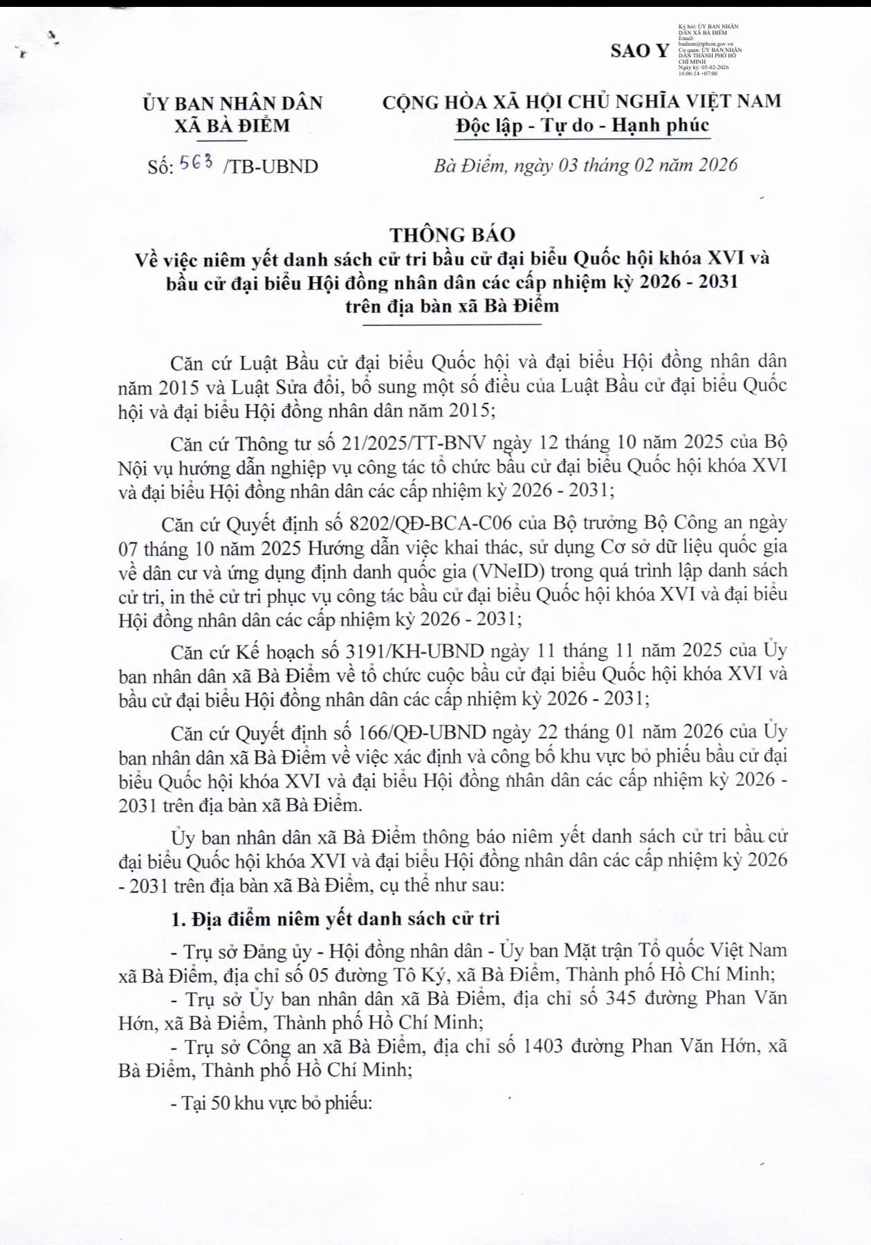 ỦY BAN NHÂN DÂN XÃ BÀĐIỂM THÔNG BÁO NIÊM YẾT DANH SÁCH CỬ TRI BẦU CỬ ĐẠI BIỂU QUỐC HỘI KHÓA XVI VÀ BẦU CỬ ĐẠI BIỂU HỘI ĐỒNG NHÂN DÂN CÁC CẤP NHIỆM KỲ 2026 - 2031 TRÊN ĐỊA BÀN XÃ BÀ ĐIỂM