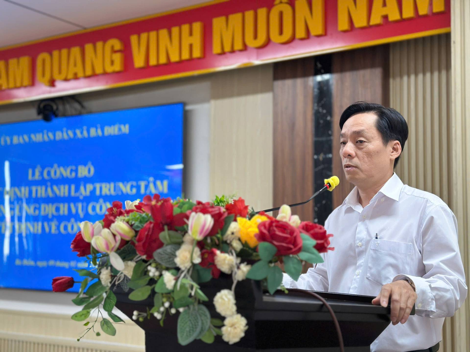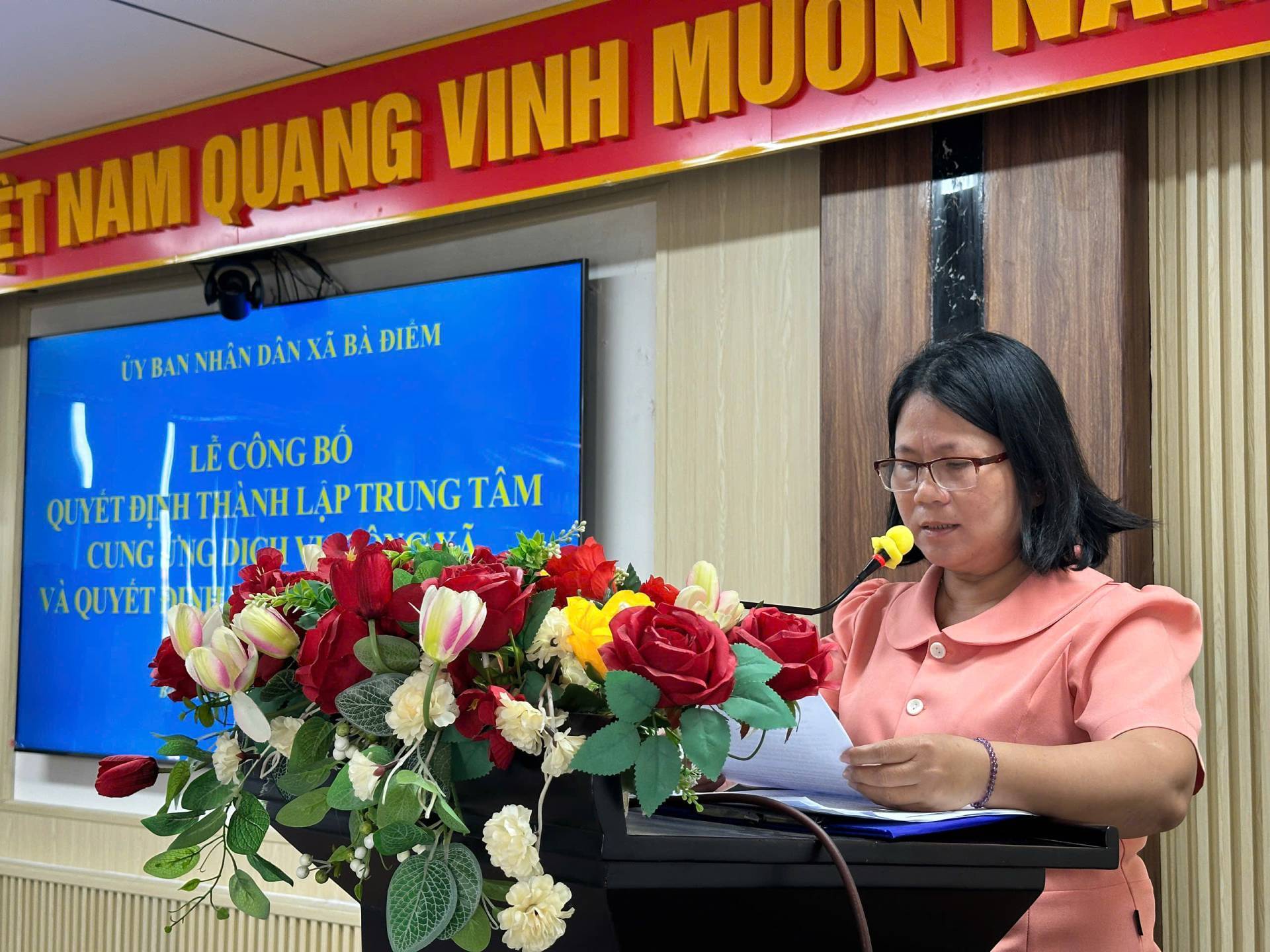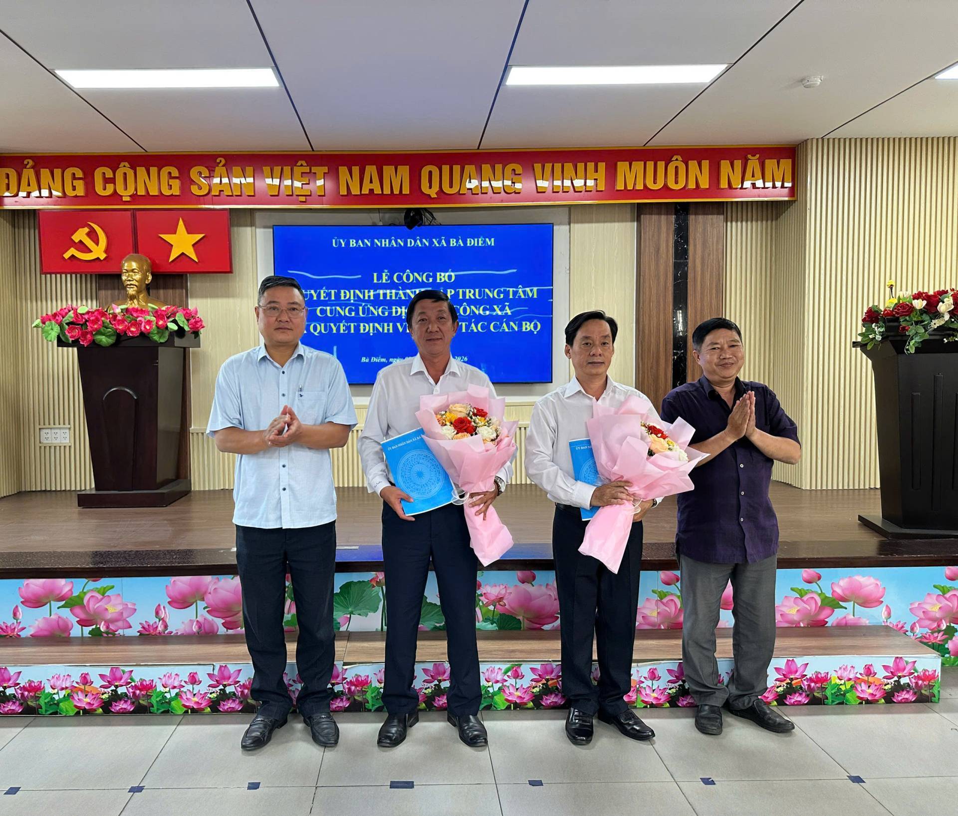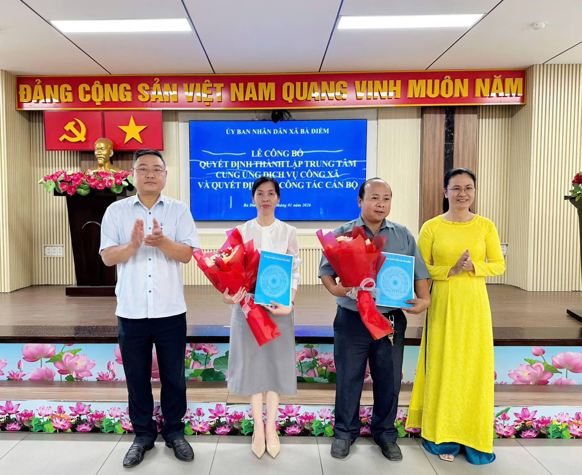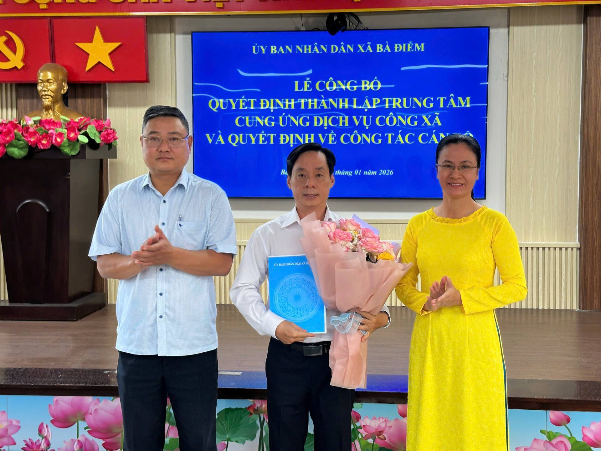 Sáng ngày 09/01/2026, tại hội trường Ủy ban nhân dân xã Bà Điểm, Ủy ban nhân dân xã tổ chức Lễ công bố Quyết định thành lập Trung tâm Cung ứng dịch vụ công xã và trao Quyết định công tác cán bộ. Tham dự có đồng chí Nguyễn Tuấn Anh - Phó Bí thư Đảng ủy, Chủ tịch Ủy ban nhân dân xã; đồng chí Trần Thúy Hương - Ủy viên Ban Thường vụ Đảng ủy, Phó Chủ tịch Ủy ban nhân dân xã; đồng chí Nguyễn Khắc Tỉnh - Đảng ủy viên, Phó trưởng Ban Xây dựng Đảng Đảng ủy xã; đồng chí Dương Thị Mỹ - Đảng ủy viên, Trưởng Phòng Văn hóa - Xã hội xã…