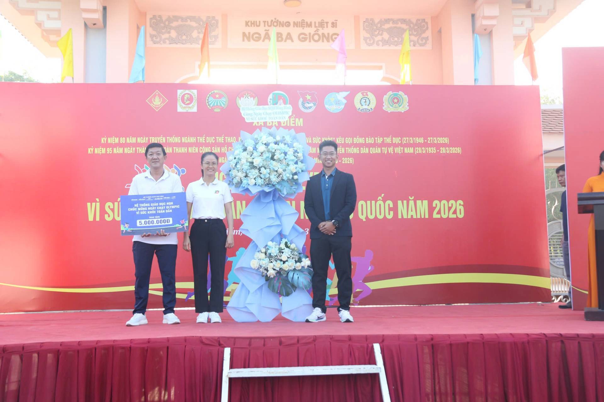 Tại buổi Lễ, ông Trương Phú Tuấn - Giám đốc khu vực 3, Hệ thống Giáo dục NQH - đại diện đơn vị đồng hành đã tặng lẵng hoa chúc mừng và trao biểu trưng kinh phí hỗ trợ 5 triệu đồng.